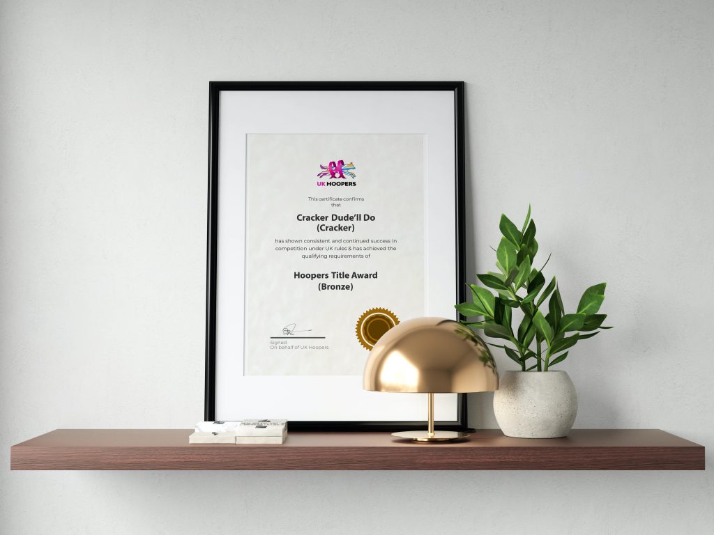 Each Hoopers Title Award comes with a beautiful A5 certificate to mark your achievement and a stunning 6″ rosette, handlmade using English, satin faced ribbon. The cost for the award is just £5 including certificate, rosette and P&P.